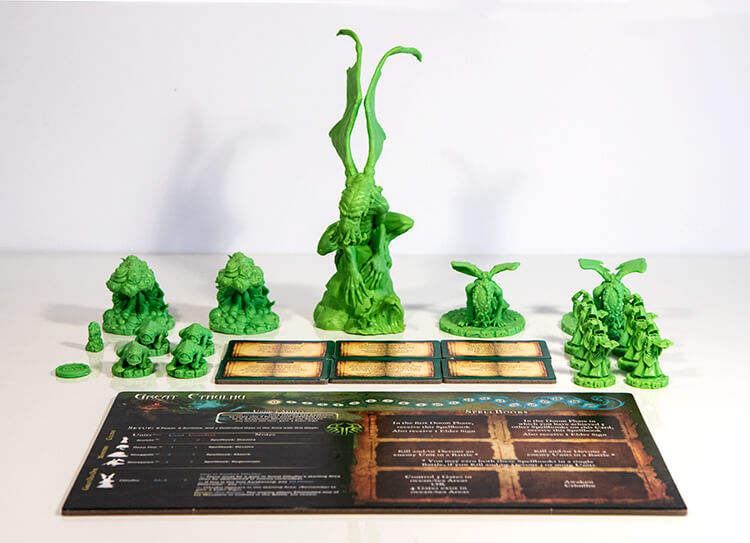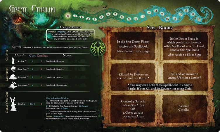 Playing as Cthulhu also generally depends upon awakening him fairly soon. His combat power is formidable in the beginning of the game, but the static value means that he loses some of his combat relevance as the other players' Great Old Ones are becoming much more powerful. Because Cthulhu is largely hoping for a slow-burn victory, he'll need to act as an enforcer to keep the other players from having too big of a turn in the early game. Summoning Cthulhu really aids in this, especially if you've chosen "Submerge" as your spell book.