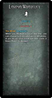 The Bride (Ongoing): When you Awaken a Great Old One, you can choose to Eliminate Lavinia Whateley. If you do so, your Great Old One costs 3 Power less to Awaken. | ||||||