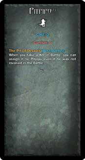 The Pit of Despair (Post-Battle): When you take a Kill in Battle, you can assign it to Pitpipo, even if he was not involved in the Battle. | ||||||