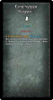A Simple Rustic Maid (Ongoing): Any player (including you) who declares a Battle in Ermengarde Stubb's Area immediately loses 1 Doom. | ||||||