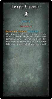 Beyond the Spheres (Ongoing): After any player's Action, you may Eliminate Curwen and either remove your Controlled Gate (but not its Controller) from anywhere on the Map, or place a new Gate in any Area in which you have a Unit. | ||||||