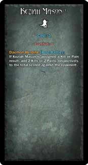 Daemon Heroine (Post-Battle): If Keziah Mason is assigned a Kill or Pain result, add 2 Kills or 2 Pains, respectively, to the total scored against the opponent. | ||||||