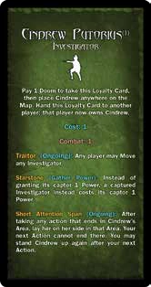 | Traitor (Ongoing): Any player may Move any Investigator. Starstone (Gather Power): Instead of granting its captor 1 Power, a captured Investigator instead costs its captor 1 Power. Short Attention Span (Ongoing): After taking any action that ends in Cindrew's Area, lay her on her side in that Area. Your next Action cannot end there. You may stand Cindrew up again after your next Action. | |||||||