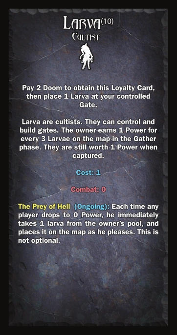 | Notes: Larva are cultists. They can control and build gates. The owner earns 1 Power for every 3 Larvae on the map in the Gather phase. They are still worth 1 Power when captured. | |||||||