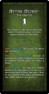 How to Obtain the Hannah Hazard Loyalty Card: Pay 1 Doom to take this Loyalty Card. Hand it to another player, who then places Hannah into their Pool. | ||||||