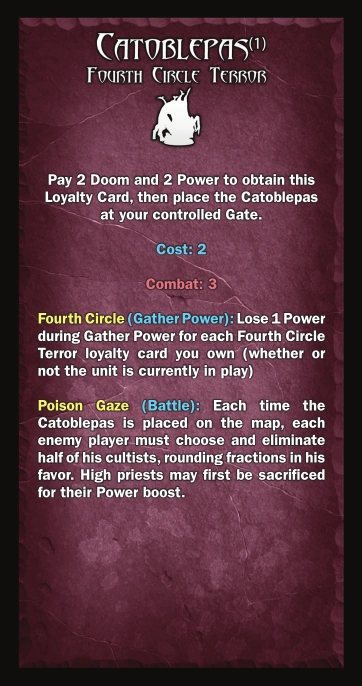 | Fourth Circle (Gather Power): Lose 1 Power during Gather Power for each Fourth Circle Terror loyalty card you own. (whether or not the unit is currently in play) Poison Gaze (Battle): Each time the Catoblepas is placed on the map, each enemy player must choose and eliminate half of his cultists, rounding fractions in his favor. High priests may first be sacrificed for their Power boost. | |||||||