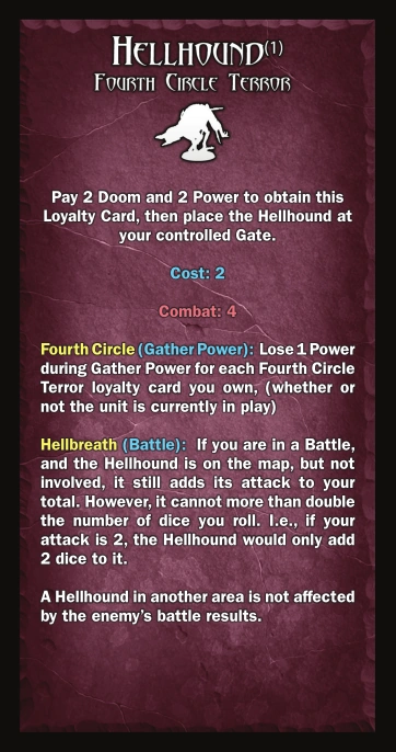 | Fourth Circle (Gather Power): Lose 1 Power during Gather Power for each Fourth Circle Terror loyalty card you own. (whether or not the unit is currently in play) Hellbreath (Battle): If you are in a Battle, and the Hellhound is on the map, but not involved, it still adds its attack to your total. However, it cannot more than double the number of dice you roll. I.e., if your attack is 2, the Hellhound would only add 2 dice to it. A Hellhound in another area is not affected by the enemy's battle results. | |||||||