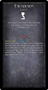 How to Obtain the Cacodemon Loyalty Card: Pay 2 Doom and 2 Power, then place the Cacodemon in an Area with your Controlled Gate. | ||||||