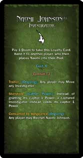 How to Obtain the Naomi Johnson Loyalty Card: Pay 1 Doom to take this Loyalty Card. Hand it to another player, who then places Naomi into their Pool. | ||||||