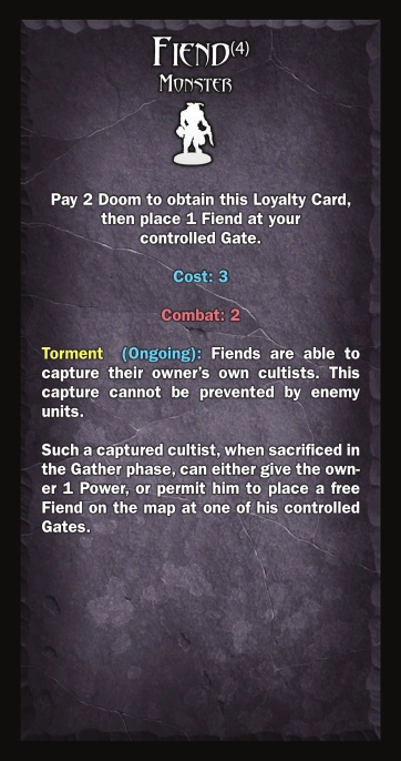| Torment (Ongoing): Fiends are able to capture their owner's own cultists. This capture cannot be prevented by enemy units. Such a captured cultist, when sacrificed in the Gather phase, can either give the owner 1 Power, or permit him to place a free Fiend on the map at one of his controlled Gates. | |||||||