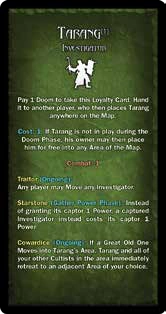 How to Obtain the Tarang Loyalty Card: Pay 1 Doom to take this Loyalty Card. Hand it to another player, who then places Tarang anywhere on the Map. | ||||||